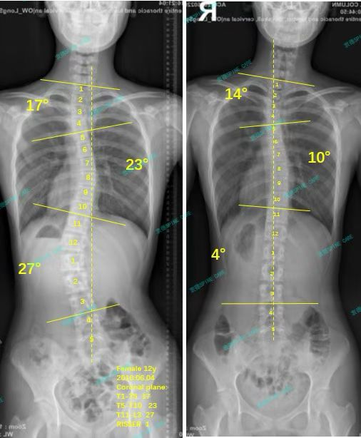 Until now, I have been training here for more than 3 years. Dr. Yang is very responsible, always paying attention to my posture and adjusting my training plan in a timely manner. The rehabilitation therapists are very patient and often encourage me. The most recent X-ray showed that my thoracic curve angle decreased from 23 degrees to 10 degrees, my lumbar curve from 27 degrees to 4 degrees, my upper thoracic curve from 17 degrees to 14 degrees, and my thoracic rotation from 5 degrees to 1 degree. My posture is getting better and better, and now I am very upright. But I will still continue to train here. Dr. Yang said that once I reach adulthood, the angle will basically not get worse.