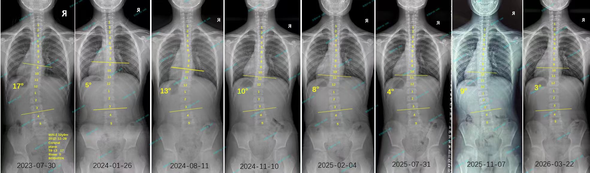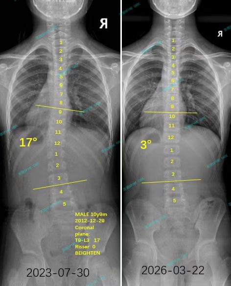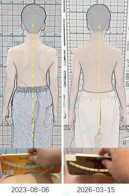 As expected, all my hard work paid off: the angle has now decreased to 3 degrees, and my posture has significantly improved.Dr. Yang explained that rehabilitation is akin to climbing a mountain; occasionally, you might slip, but as long as you stay on the right path, you will eventually reach the summit. For me, the songs by TFBoys have served as background music, giving me the strength to take each step forward. I am deeply grateful to Dr. Yang and his team for their professional guidance; without their expertise, I fear I would have taken many unnecessary detours in my journey toward recovery from scoliosis.