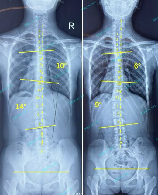 最近拍片发现我的角度从14度降到了9度,我很高兴,坚持真的非常重要!我的体态也看起来好多了。现在我的下肢长度基本一致,已经不用再继续垫鞋垫了。