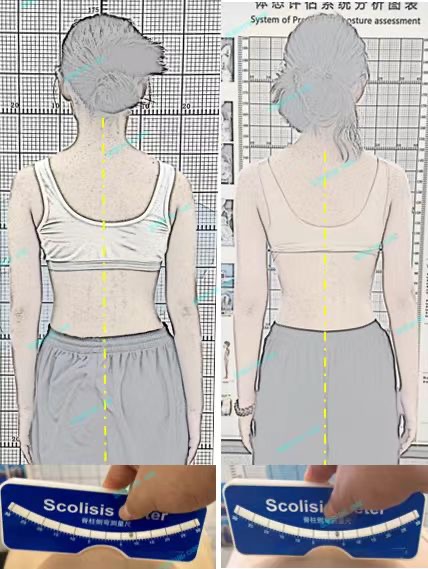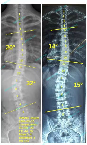 After Dr. Yang looked at my x-ray and evaluated my posture, he suggested that I do ZDT corrective training + wear brace. My mother and I decided to try it under Dr. Yang's major. At first, the results of taking x-ray with braces were very good. I also insisted on coming to Zhongde for spinal training every week and wearing braces every day. Later, the x-ray taken with braces showed that my degree had dropped by half! This also gives me more motivation to continue training.