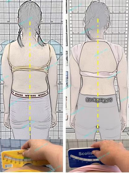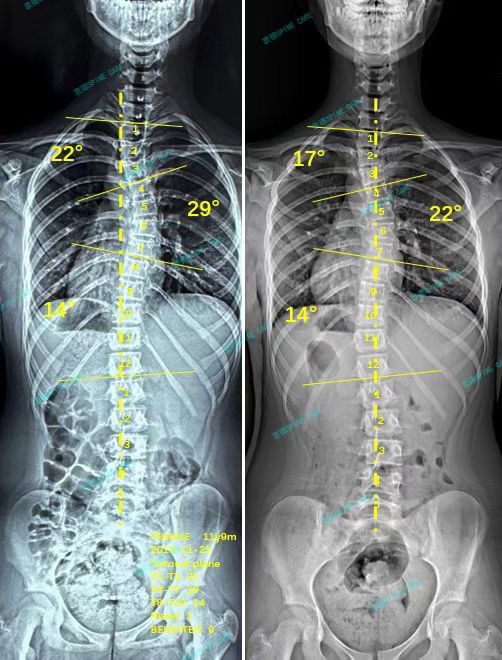 一开始我只有7度的脊柱侧弯,医生说并不需要干预,于是我们就放心地回家了。但是三个月前爸爸妈妈再次带我去医院拍x片检查的时候,发现我的侧弯居然增长到了22度!医生说我必须要戴支具了,我没有接触过支具,我很害怕。爸爸妈妈也担心我不适应支具和影响我的生活,所以开始四处打听能治疗侧弯的地方……