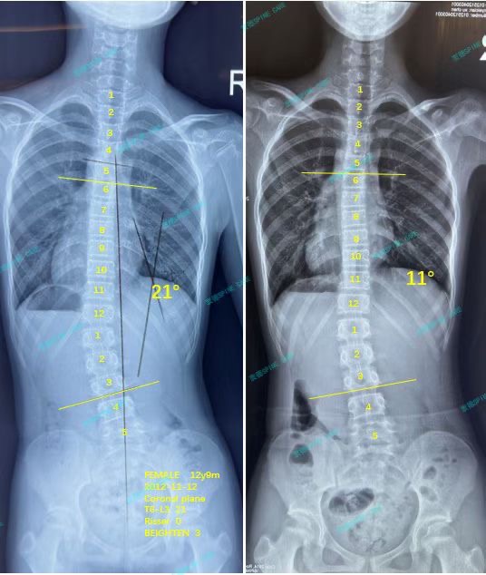 就这样坚持了三个月后,x片显示我的腰弯从21度降到了11度,我们都非常高兴!不用全天都戴着难受的支具,只要我坚持下来每天的训练,就会有很好的收获!