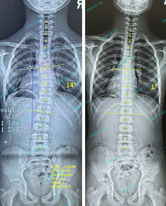 The rehabilitation therapists at Zhongde Spine are all very kind. Every time during training, the teachers would teach me patiently, and Dr. Yang would also check my posture. After three months of training, the X-ray showed that my thoracic curvature angle had decreased from 14 degrees to 1 degree, and my posture had improved significantly. I'm very happy~