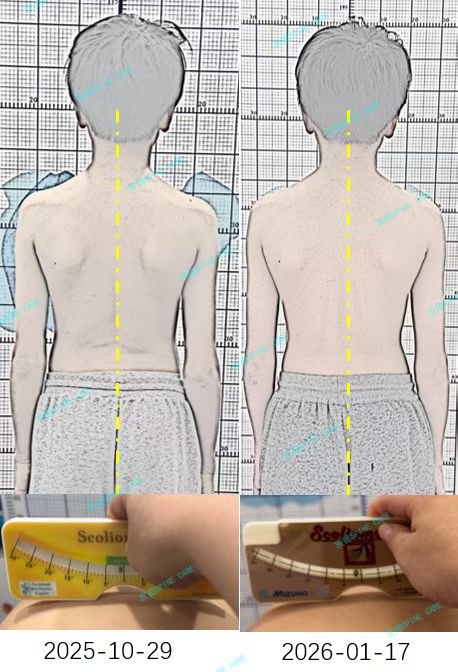 Hello everyone, I'm Leo, an 11-year-old boy from the UK. After my mother found out that I have a 14-degree scoliosis, she took me to see Dr. Yang. Dr. Yang said that my curvature angle wasn't very large and that with serious training, it could be improved, and my posture would also change. So I secretly made up my mind to work hard on the correction exercises and not let my mother worry.